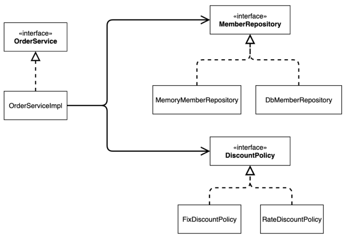 - OrderServiceImpl -> MemoryMemberRepository , FixDiscountPolicy