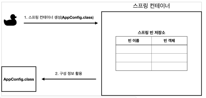 - 스프링 컨테이너를 생성할 때는 구성 정보를 지정해주어야 한다(AppConfig.class)