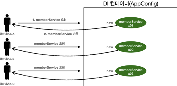 - 이때 지금까지의 순수한 자바만의 AppConfig 는 요청마다 객체를 새로 생성